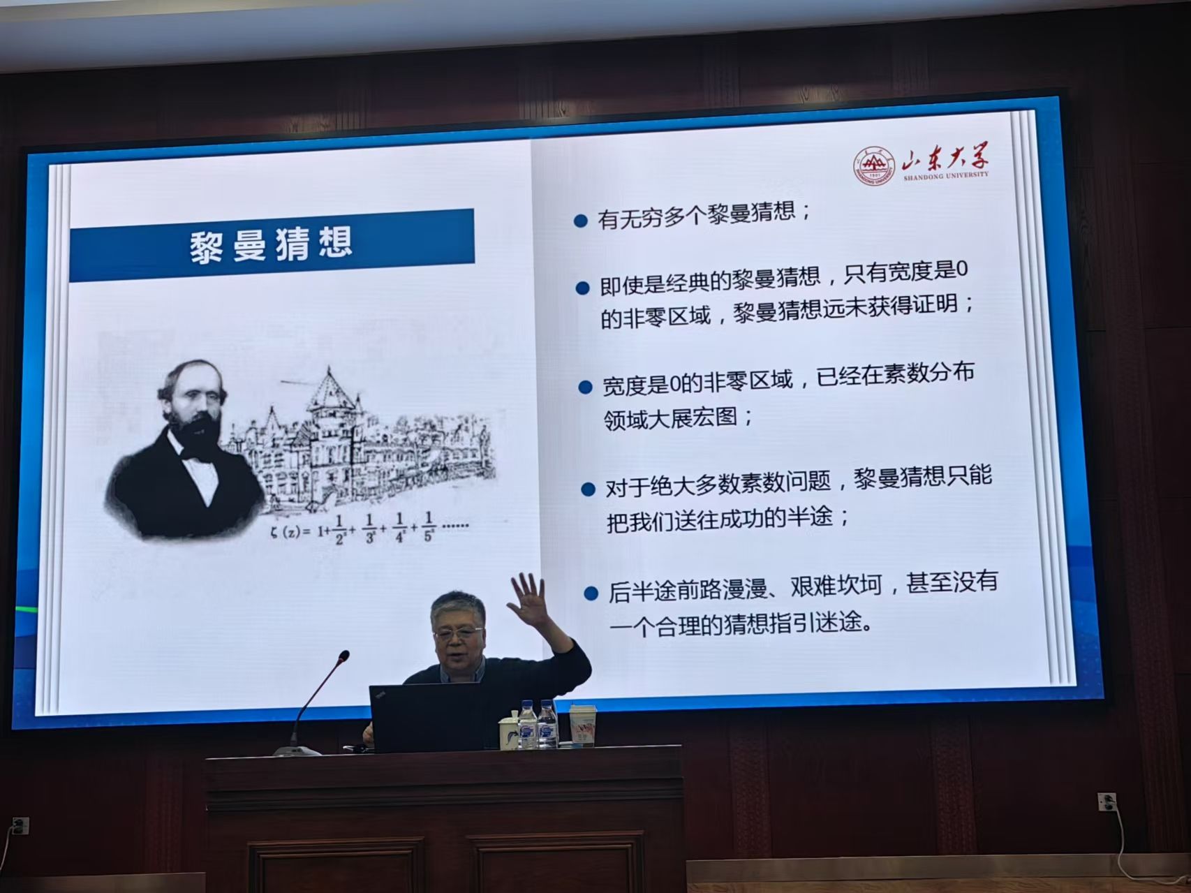 刘建亚教授以通俗易懂的语言,深入浅出地介绍了数论这门古老的数学分支。数论是研究整数性质的学问,而整数可以分解为素数的乘积,因此素数分布是数论的核心问题。报告围绕“如何研究素数分布,以及如何研究涉及素数的猜想”的主题,包括哥德巴赫猜想、Sarnak关于素数在群作用轨道上分布的纲领性猜想等,从哲学的角度介绍相关历史、猜想、以及思想方法,着重介绍了最新进展。刘建亚教授的报告不仅展示了他深厚的学术造诣,更体现了他对数学的热爱和对科学的探索精神。他鼓励师生积极思考,勇于探索,不断攀登数学高峰。