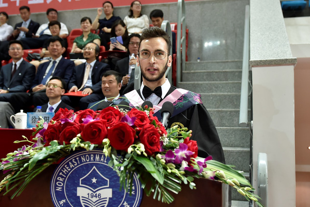 教师代表、美术学院院长李书春教授,毕业生代表、政法学院本科毕业生刘强,留学生代表、国际汉学院本科毕业生斯比罗斯,校友代表、95届中文系毕业生、附属中学首席教师、特级教师孙立权教授作了充满激情的发言,引起了全场的热烈共鸣。