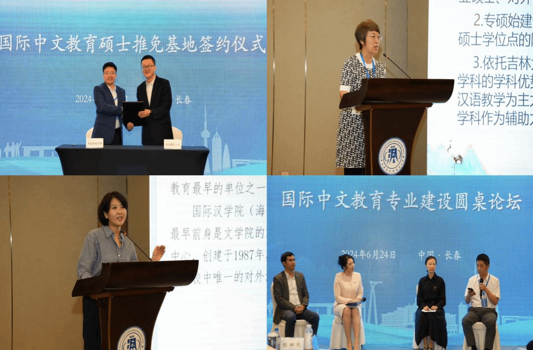 24日下午,大会分会场举办了“东师国际中文教育专业硕士推免基地签约仪式”“国际中文教育专业建设研讨会”及圆桌论坛。签约仪式上,我校与东北农业大学、东北林业大学、辽宁大学、延边大学、北华大学、吉林师范大学等国内17所高校共同签署了推免基地协议。签约仪式后,吉林大学刘艳茹教授,我校王宇副教授、优秀学生代表进行了专题汇报。会议期间,国际汉学院副院长沈薇薇与4位嘉宾就专业建设、人才培养等开展圆桌论坛。
