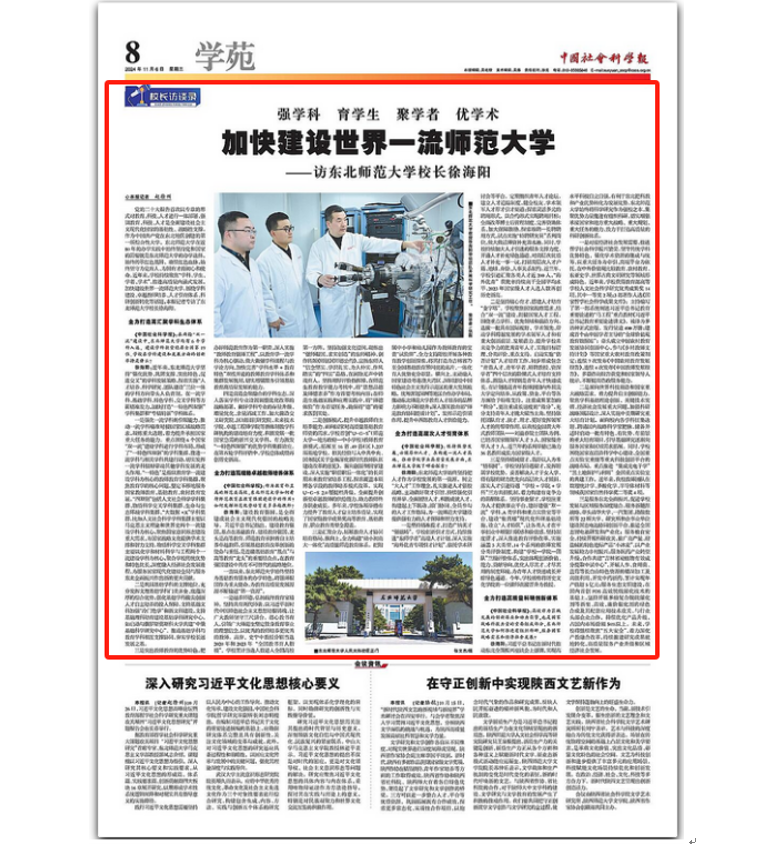 11月6日,《中国社会科学报》对我校校长徐海阳进行了专访。徐海阳从“全力打造高汇聚学科生态体系”“全力打造高规格卓越教师培养体系”“全力打造高层次人才引育体系”“全力打造高质量科研创新体系”四个方面,介绍了学校推进高质量内涵式发展的经验作法。