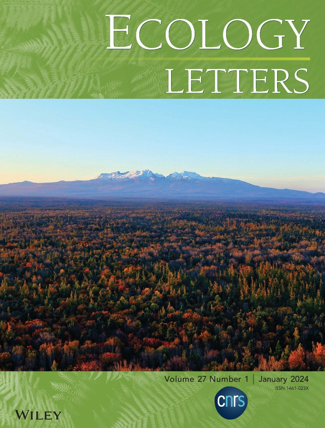 图1. Ecology Letters封面文章(Liu et al., 2023, Ecology Letters)。图中为长白山北坡远景(吴正方摄)