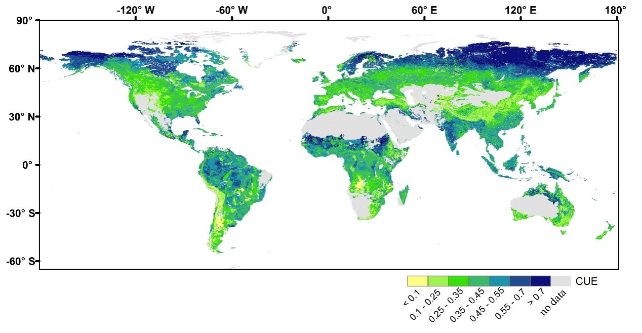 图3.0-30cm土壤深度中土壤微生物碳利用效率的全球格局(Gao et al.,2024,SBB)